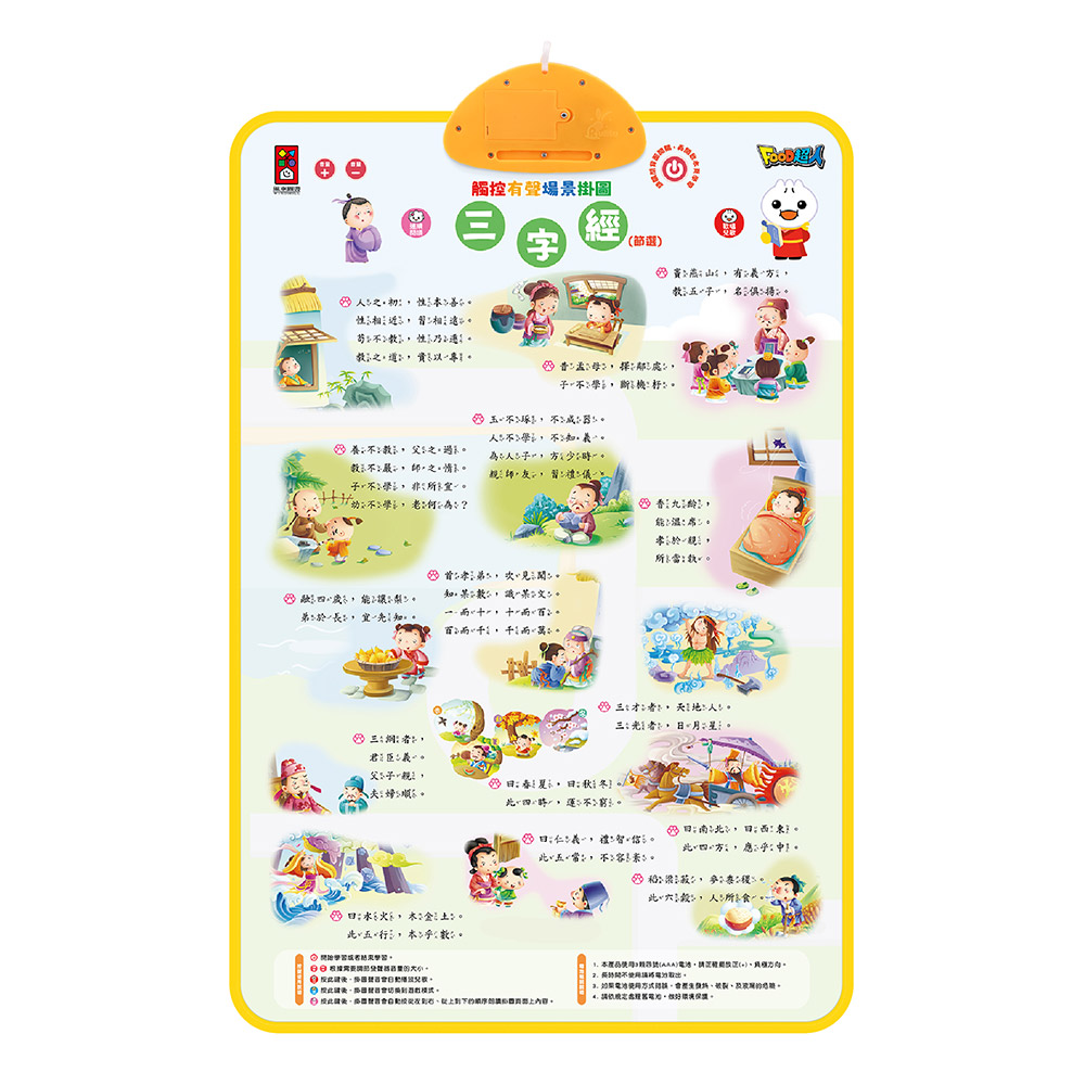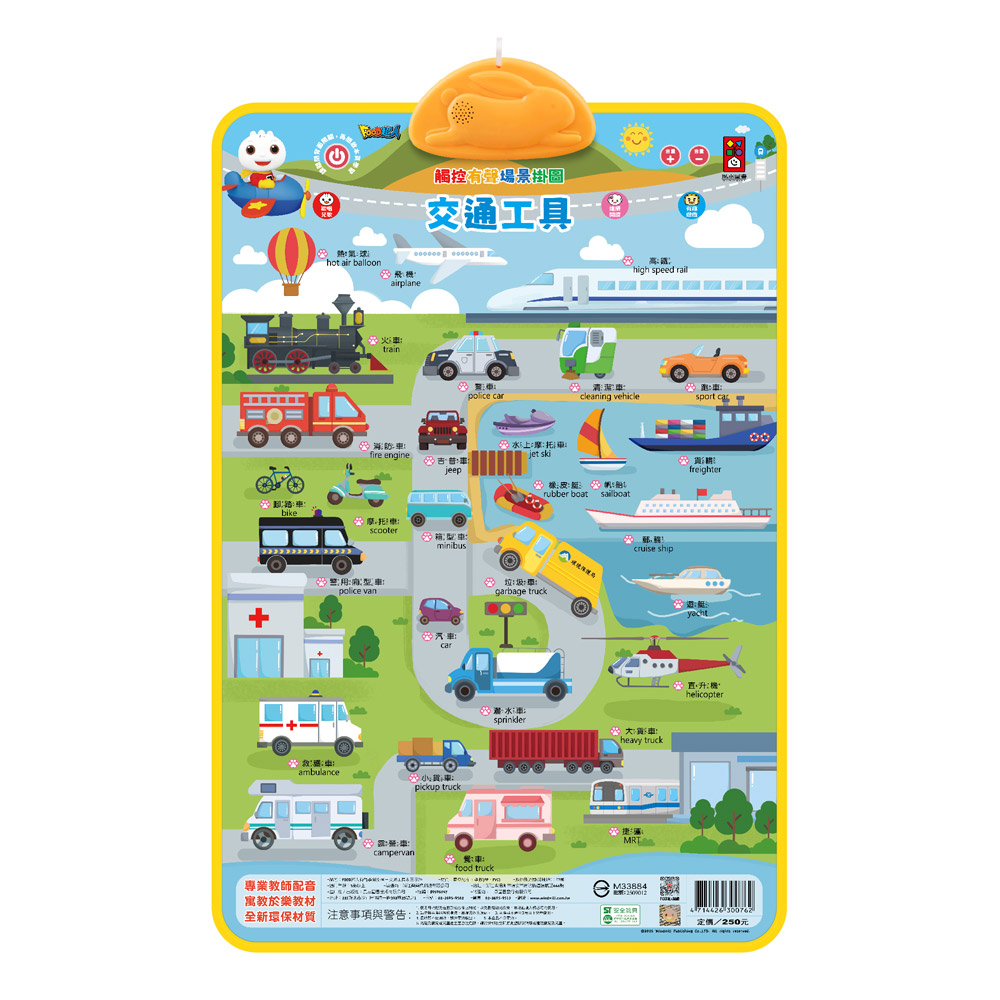 《FOOD超人有聲學習掛圖-交通工具&三字經》雙面不同的學習主題,同時學習交通工具的雙語單詞以及國學三字經,兩種主題一次滿足!只要用手指輕輕一按即能發聲,加上多種功能建切換學習模式,也有問題遊戲幫助小朋友加深學習印象與強化互動閱讀性,並還有歡唱兒歌,陪伴孩子一起唱唱跳跳學語言、學知識!