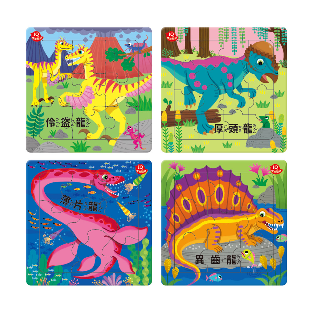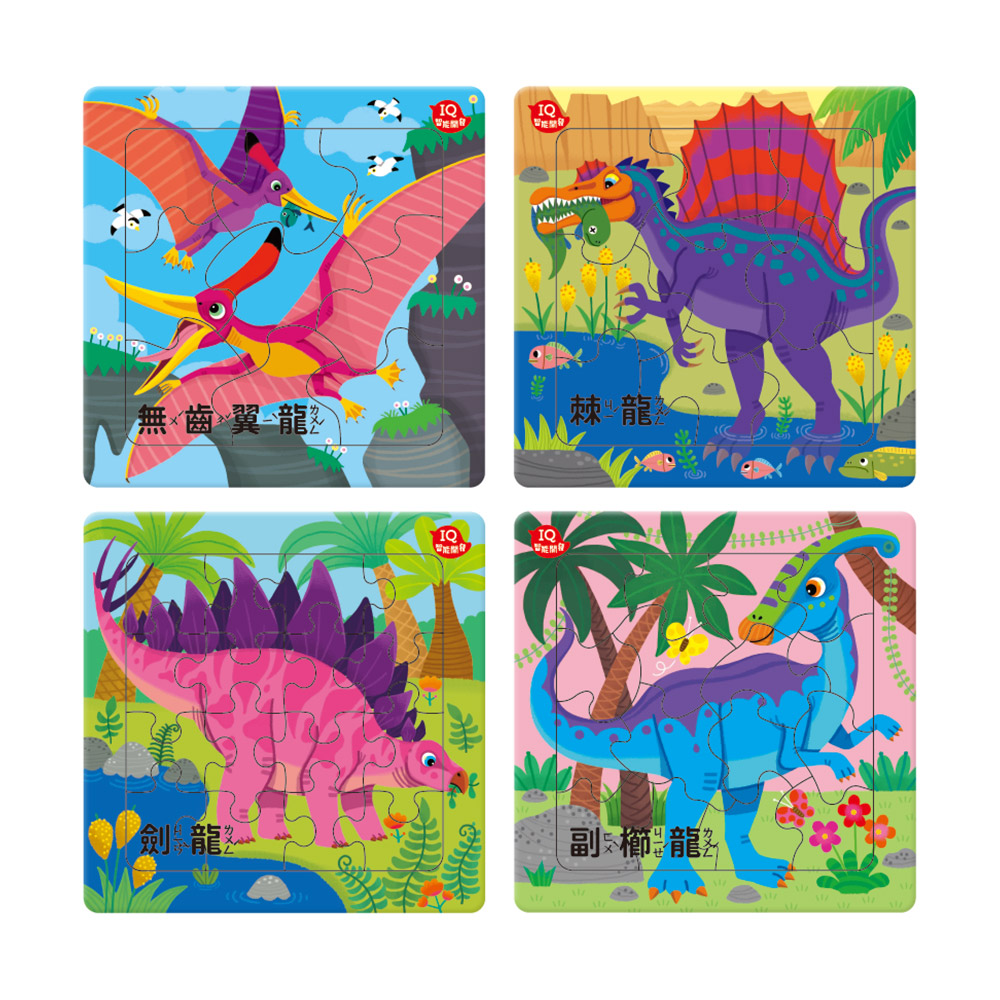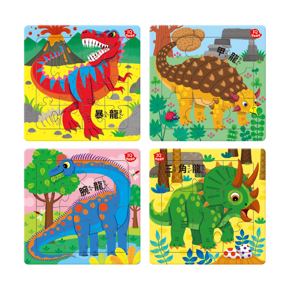 12種不同的拼圖搭配恐龍主題,拼圖板背面可拼成大拼圖,還能玩場景遊戲!