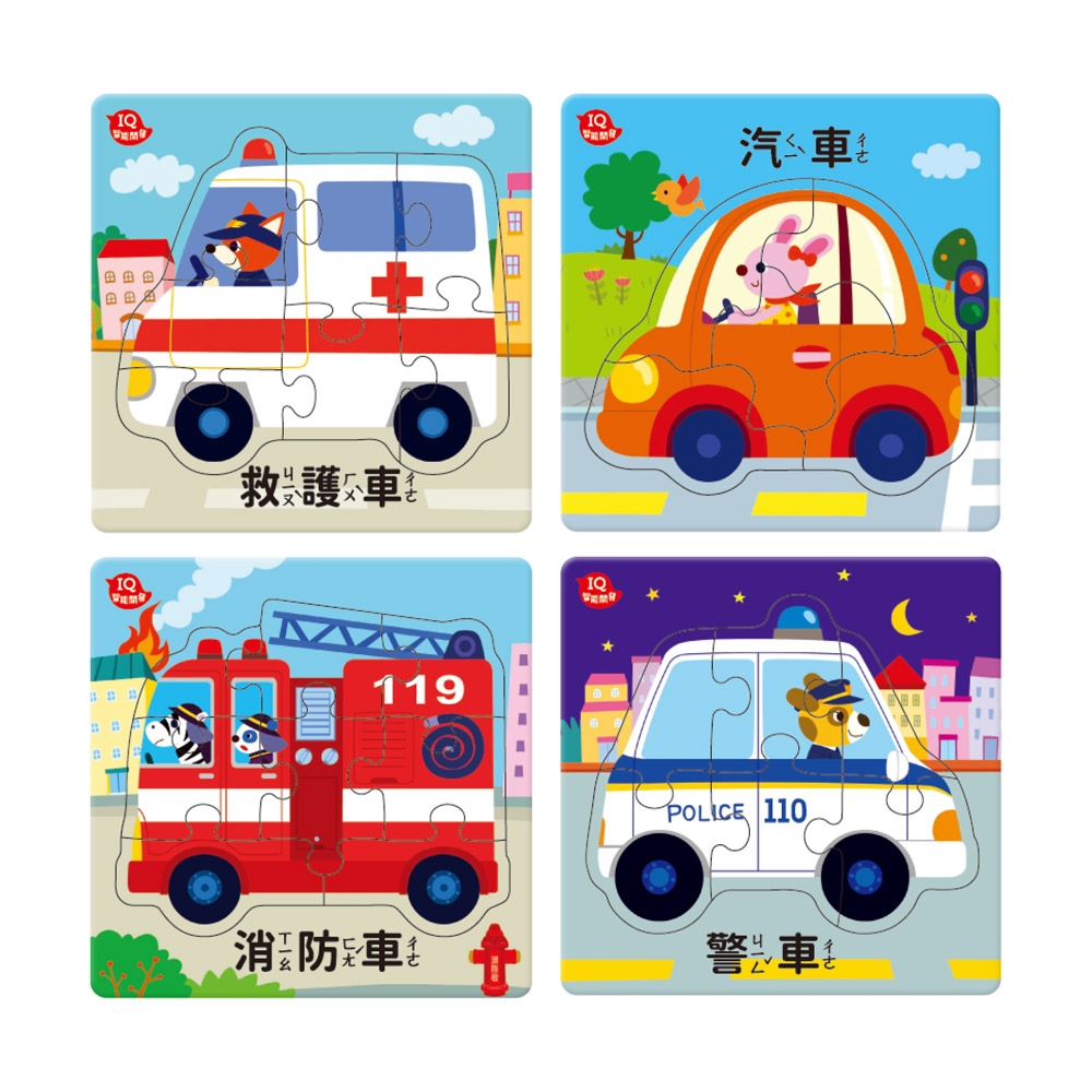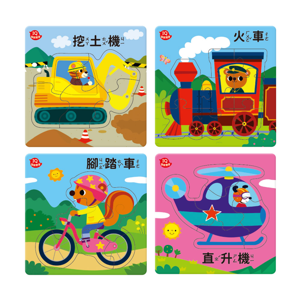 12種不同的拼圖搭配不同交通工具,拼圖板背面可拼成大拼圖,還能玩場景遊戲!